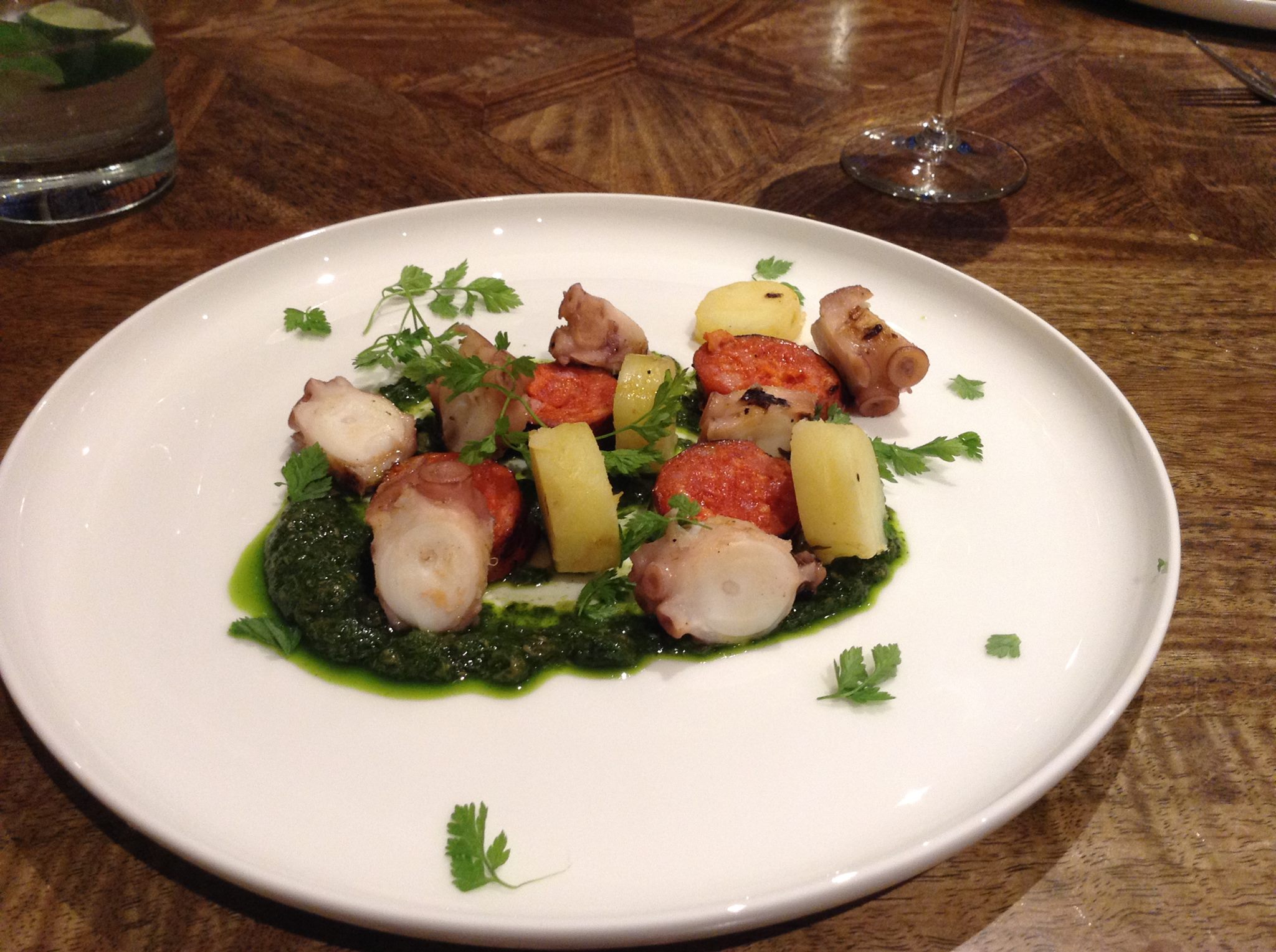 The key to this dish is the octopus, which gets five hours in the water bath at 77C (or 170F in the old money) with an herb sachet, as well as using a good chorizo. Oh, and a bright salsa verde with a big handful of basil and smaller doses of fresh tarragon, cilantro and parsley, al quickly blanched and shocked, and whizzed with olive oil, toasted ground cumin and coriander seeds, and finished with a squeeze of lemon and minced capers. And kipfler potatoes, just boiled and then peeled and cut into discs.