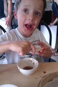 The san choy bao hit the table promptly, and was everything it should have been: crisp lettuce, rich and not-unpleasantly salty filling. The steamed xiao long bao were not far behind, and  were a huge hit with the boys. In fact, we should have ordered double: