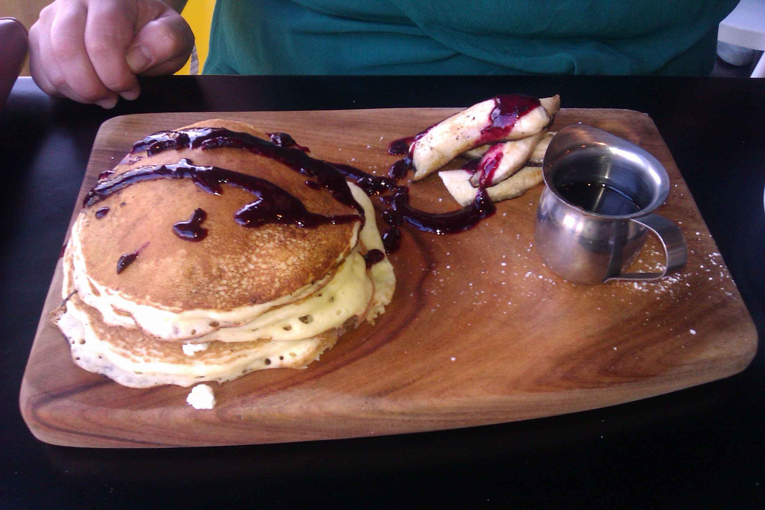 I mean, who puts pancakes on a cutting board? With a hole in it, no less? I mean, syrup, people!