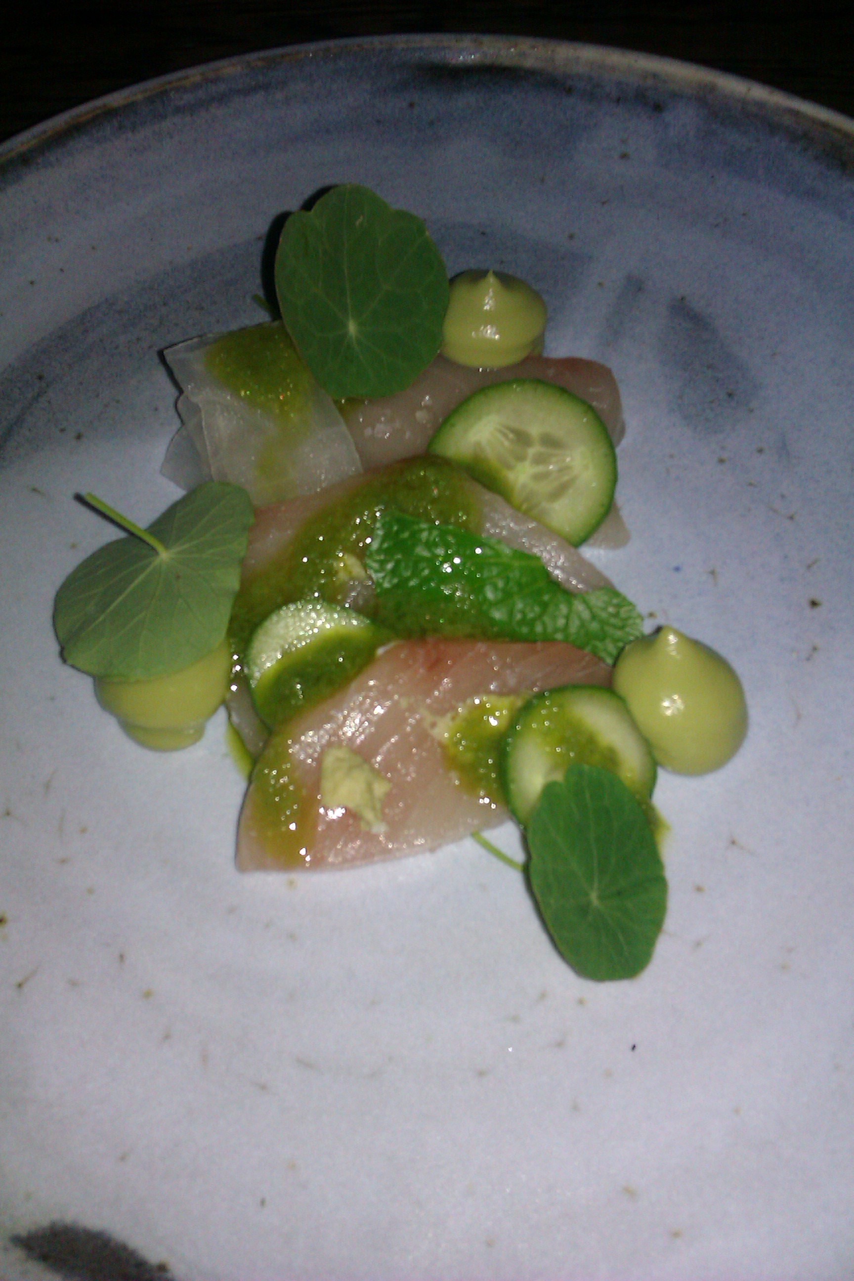 Swordfish sashimi was a bright delight; Mrs Prick thought there was just the right amount of wasabi though I could have done with one less globule. A pickled octopus with aioli and smoked paprika was  a gem. And a dish of spanner crab and abalone (something I’ve loathed since a bad experience in Shanghai) was, at table, surrounded by a golden chicken broth that was all umami and aromatics, as good a broth as I’ve had. These were accompanied by various wines: an Alsace pinot gris, a Manzanilla sherry, a white (didn’t know they existed!) Chateauenauf-du-Pape, and so on. Good pairings, though only the sherry really blew me away.
