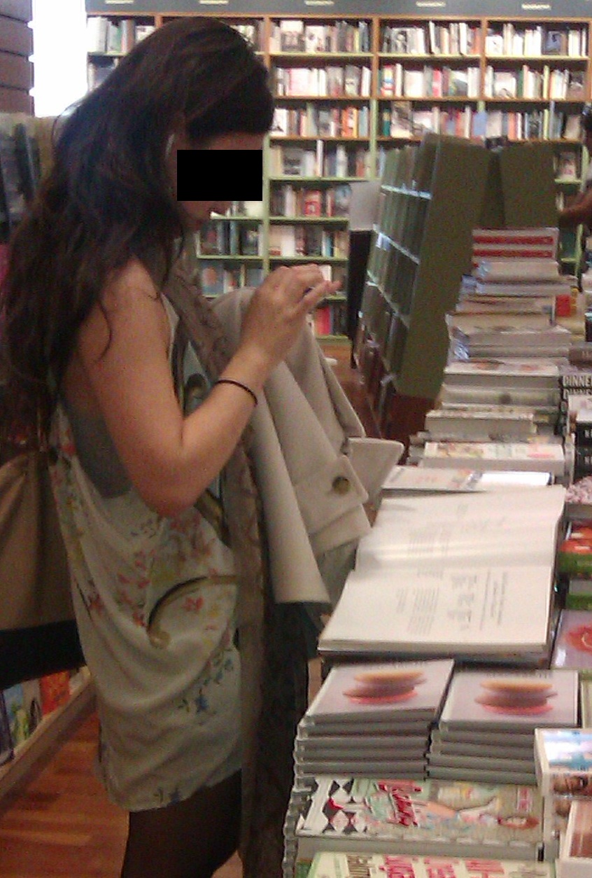 In case it’s not clear, she whipped her phone out and started shooting the recipes, presumably to take home and try later without having to go to the trouble of buying the book (and in the process contributing a small but fair share to the shop’s upkeep, the publisher’s paper bill, and the author’s mortgage). Amazingly, this was done in full sight of a security guard.