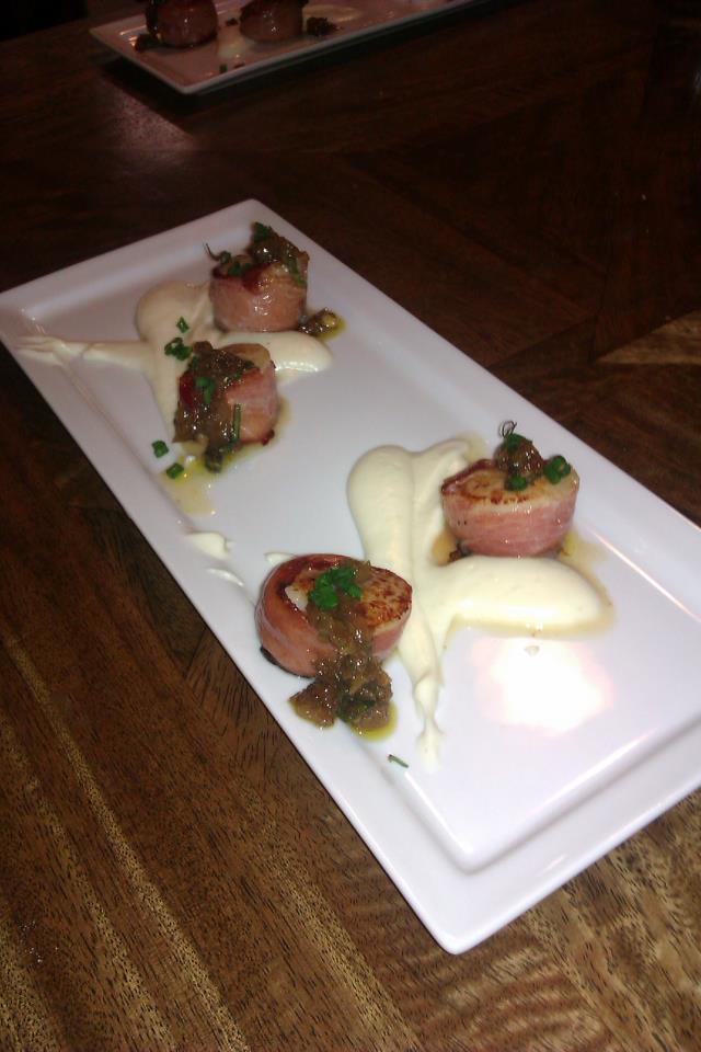 I don’t usually post much about my own cooking on this blog, but I was pretty happy with one of last night’s efforts: a tidy little starter of seared scallops with jamon Serrano, cauliflower, and anchovy-raisin dressing. A little messy on the presentation, but I was pretty happy with the results…