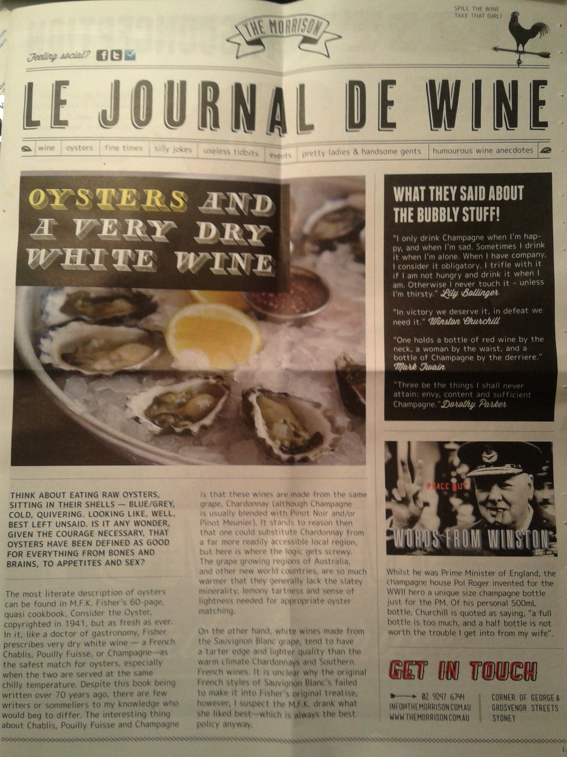 So, seated, it’s cocktails and menus time: An espresso martini (or “yuppie speedball”, as we call them) for Mrs Prick, while I try the signature Morrison cocktail (really just apple juice and vodka, refreshing but nothing special). The menu comes in two parts. An elegant food menu is supplemented by the tabloid “Le Journal de Wine”, which is one part wine list, one part oyster menu, and one part editorial: boozy quips and aphorisms from Churchill, Dorothy Parker, and Lilly Bollinger; short articles about wine and travel. Again, they’re serious about their food, but they don’t take themselves too seriously.