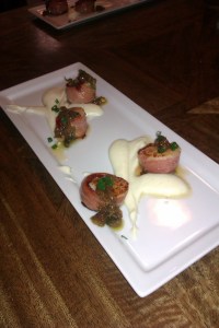 Finally, and do this as soon as you can before cooking as the salt in the ham will start to cook the delicate scallop flesh, wrap your scallops around the middle with the pork, fixing it with a toothpick (which will come out later). Use scissors to trim the excess; otherwise they won’t cook properly. Fire them off in a hot pan, about 30-45 seconds a side (remember, they’ll keep cooking after you take them off the heat), and plate up with a garnish of basil chiffonnade. In the Prick’s experience, people tend to like this: