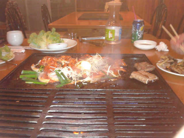 Then the main event: Barbeque, on a four-burner mounted in the middle of the table: serious stuff. First off, beef short ribs, which were butterflied and then snipped into strips. For those of us used to thinking of short ribs as a low-and-slow cut of meat, this was a revelation. In five minutes we were munching on nearly gelatinous – in a very pleasant sort of way – little morsels of the stuff. Next, a big platter of cuttlefish which was gone in sixty seconds (another thing about Korean food: you wind up eating far more than you ever thought possible), served with a heaping pile of kim chi. The middlemost of the Little Pricks especially loved this, and by this stage the ice had melted and we were getting approving nods and smiles all around. Finally, a big plate of spicy pork, again all done on the grill, and again, great stuff. We will be back, and if you can, you should go.