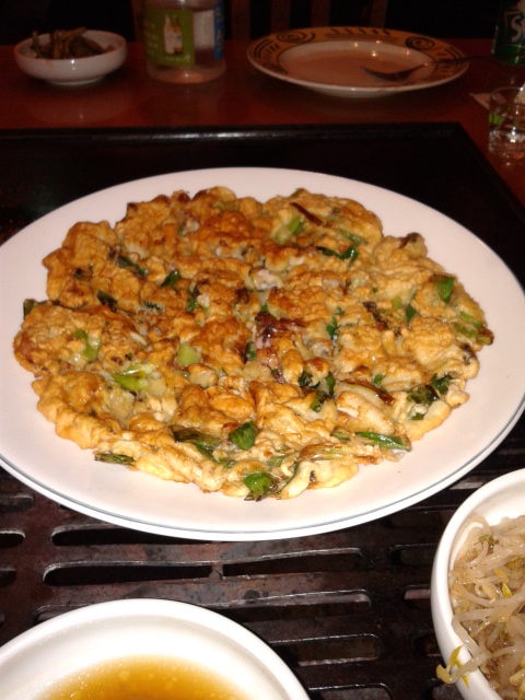 Anyway: Starters, to start. Some lovely deep-fried dumplings (none of this pan-searing for the Koreans; as noted above, when it comes to food, these people don’t mess around). Some really tender slices of pork belly, more of a platter than a plate. And a gorgeous dish, again I have no idea what any of this is called and there’s no menu on-line to speak of, which sat somewhere between a pancake and an omelette and was filled with spring onions and fish, complemented by a lovely Asian take on an agrodolce sauce on the side.