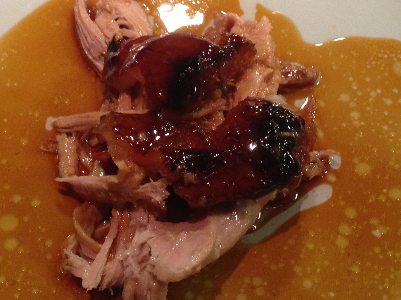 And all is forgiven with the final course, a plate of pork pulled off a massive glazed shoulder of pig that had been sitting like El Dorado’s, glowing and taunting us from its pride of place in the middle of the kitchen. No forks, no spoons, no chopsticks, just joyous feeding of our own and each others’ faces.