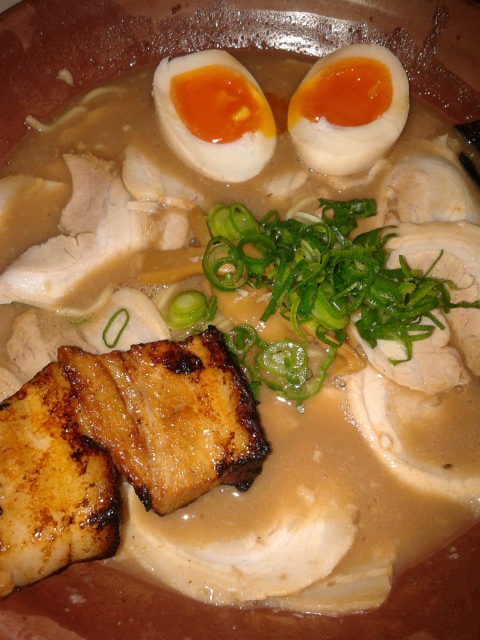 Ordering looks complex but isn’t. A few bases (including the magnificently-named $25 Super Mega Ramen, which sounds like a character in some Japanese trading card game) can be complemented with any number of toppings, in my case eggs and further grilled pork.