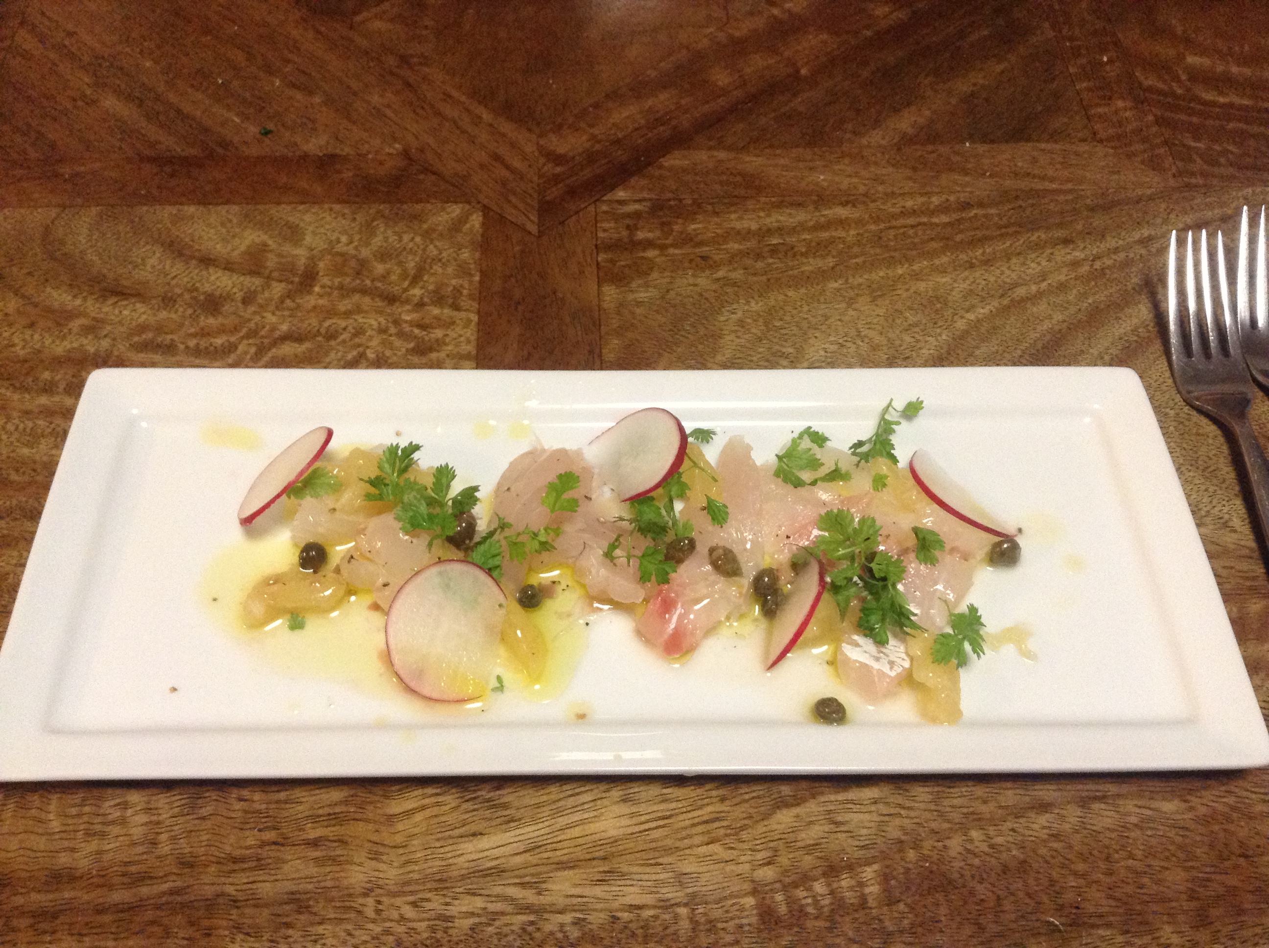 Oh, we also knocked up a quick crudo of snapper, preserved lemon, and herbs. But this was mostly to teach the boys, who’d been asking, the meaning of “ironically”. As in, “Even though dad thinks they’re kinda wanky, he’s put some thin discs of radish on our starter … ironically!”