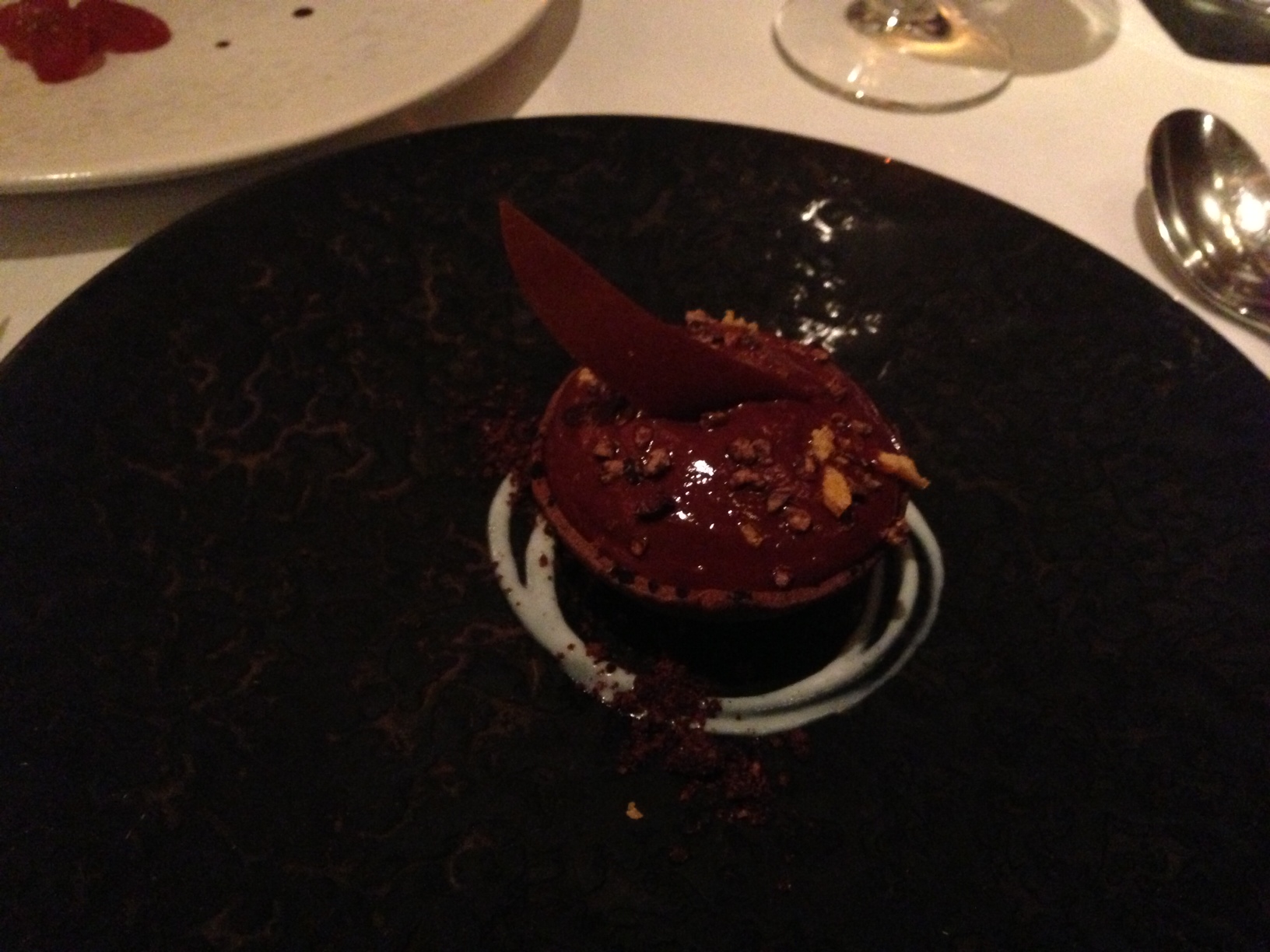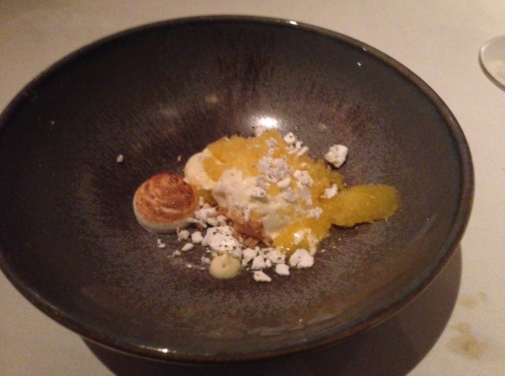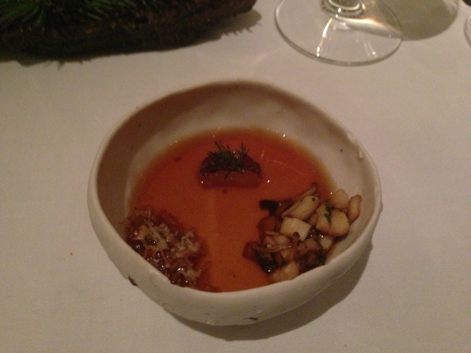 Other dishes follow: A little dish with garnishes is placed in front of each of us, truffle toasts appear on bed of pine needles, and a dipping broth of grilled onion consommé – all deep and rich and warm, it Is like eating a Bach cello suite – is poured. A large, really large diver scallop, then the tenderest pork jowl imaginable, served on a hot rock and so soft that this noble creature must never have chewed a thing but rather spent its life resting its jaw and drinking from a straw. Venison, too, just a hint of game, and set off by a meaty, tannic Napa merlot.