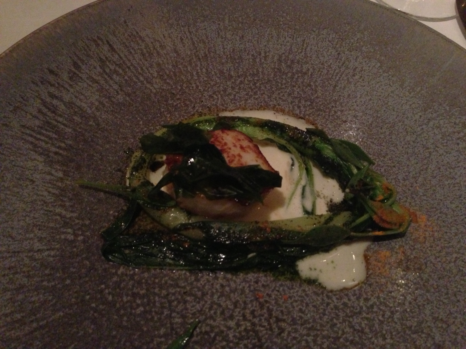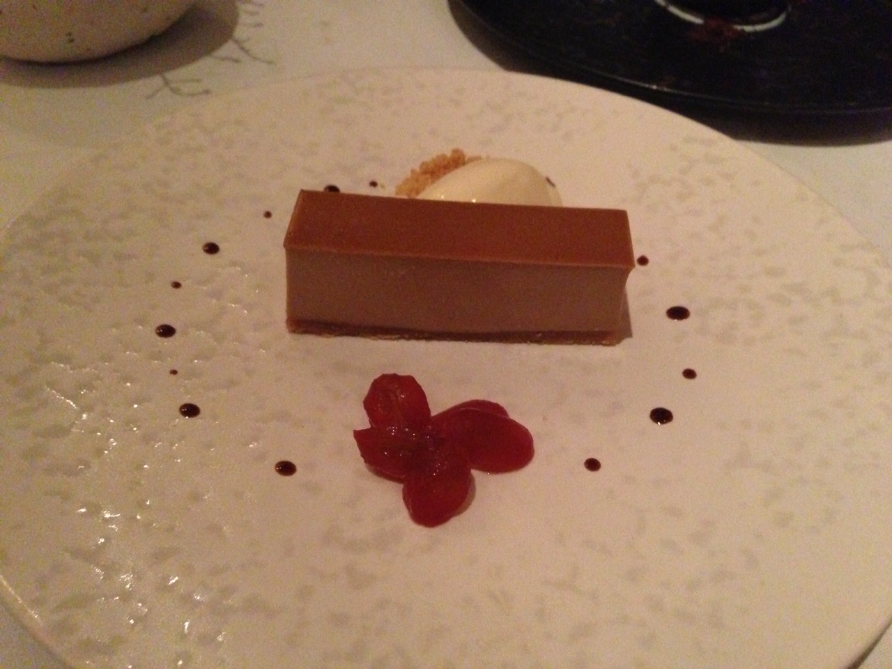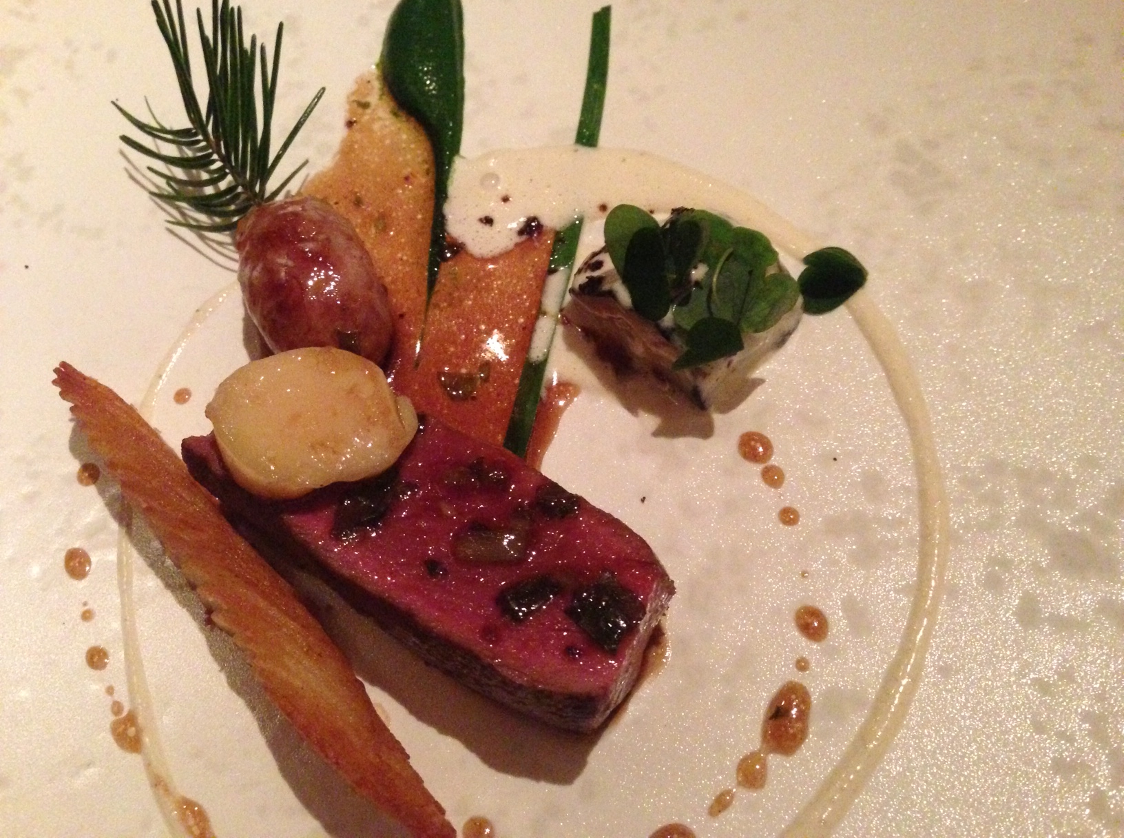 With that sort of build-up disappointment can easily beckon. Not this time. Even the bread, gossamer-light bacon rolls, defied both gravity and expectations. A first look at the tasting menu almost has us go a la carte, which is ridiculous in retrospect. Too many veggie-heavy courses at the front end we worry, before getting over our carnivorous selves. Smart move: A sort of tomato salad comes with a crostillant of goats cheese and is an education. Anyone who thinks the difference between knowledge and wisdom is simply that “knowledge knows tomatoes are a fruit, wisdom knows not to put them in the fruit salad” should try this dish. That’s only the beginning of what you know about tomatoes. Seriously.
