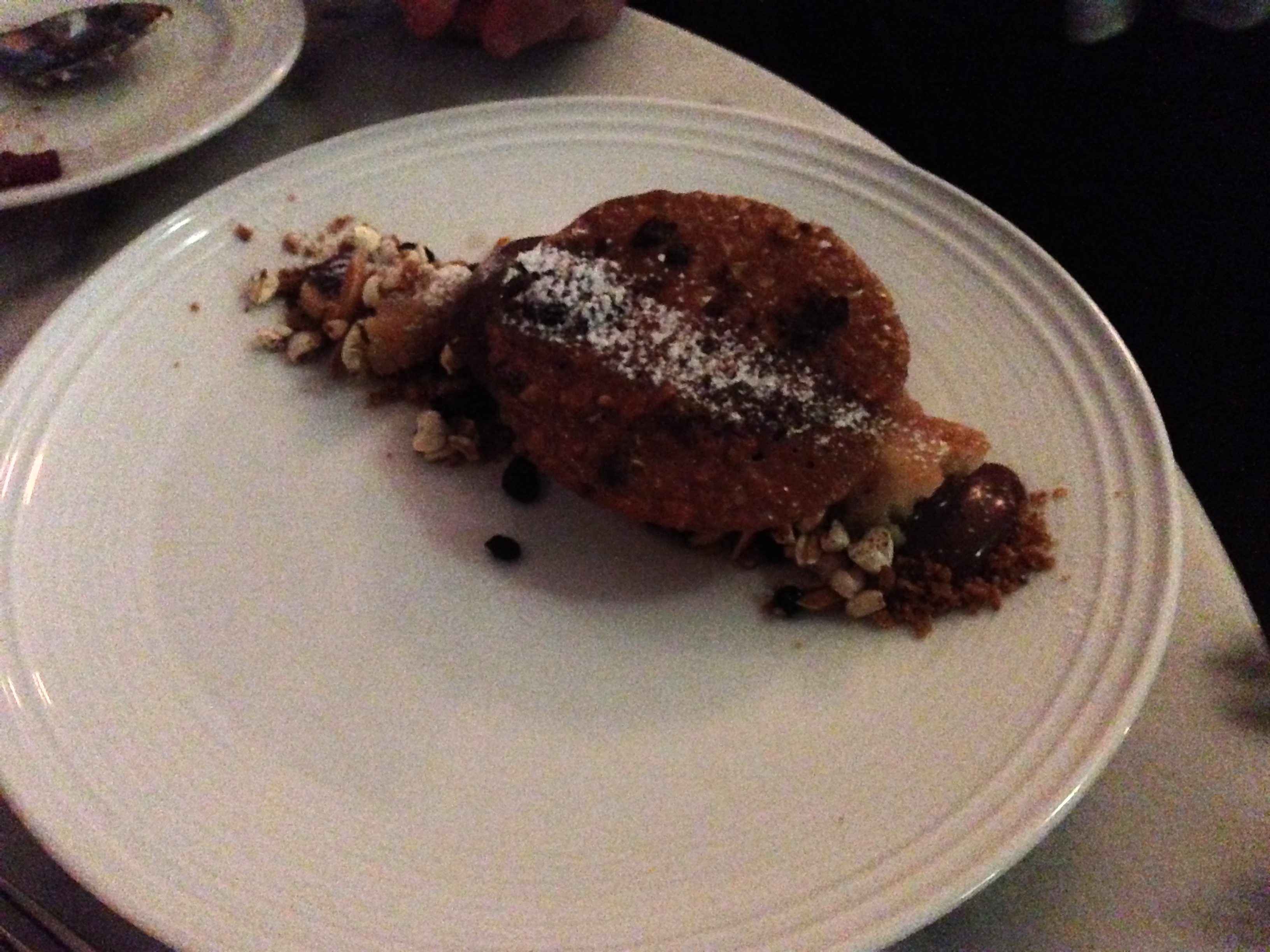 And as deeply skeptical of vegetarianism and all the other ‘arian-supremacist food movements which purport to confer moral privilege on their adherents as we Pricks are, a dark and brooding plate of grains and pine mushrooms turns out to be spectacular. Brightened by blobs of taleggio (“whipped into submission!” our server reports, delightedly) the dish pairs so well with a Piano del Cerro we are accidentally given that we ignore the minor miscue over the wine and press on with a gorgeous 2007 Tuscan number that starts out all herby and complex and gives way to silk and chocolate.